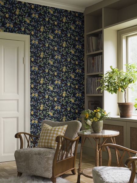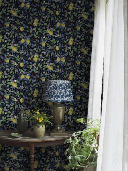 Ervaar de rustige en toch levendige charme van ons Citrontr d behang in een licht palet van witte, groene, beige, roze en gele tinten. Het Arts and Crafts ge nspireerde patroon is dicht en gedetailleerd en is ontworpen door Jenny Hahne Gadd. Het verfrissende gebladerte aangevuld met delicate bloemen en zonnige citroenen roepen de charme op van de mediterrane bossen.