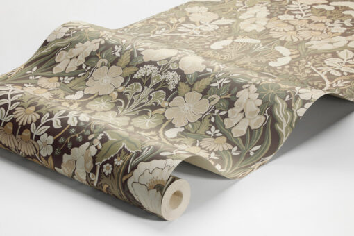 Ons rtag rd behang is weelderig en levendig gekleurd in een neutraal en eigentijds palet van groen, wit en beige tegen een opvallende bijna zwarte ondergrond. Het is met de hand geschilderd en bedrukt met een prachtig bloempatroon in Arts and Crafts-stijl, ge nspireerd op geneeskrachtige kruiden en planten.